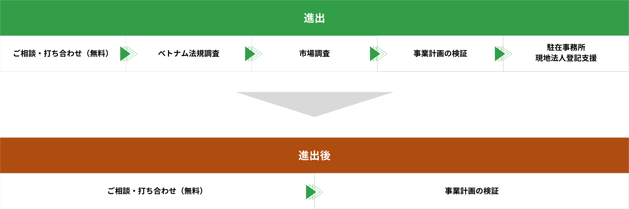 現地視察(BtoB向け)/ベトナム法規調査/登記支援(駐在員事務所・独資・合弁)/アウトソーシング(オフィス・営業代行)/契約書・通訳支援 など